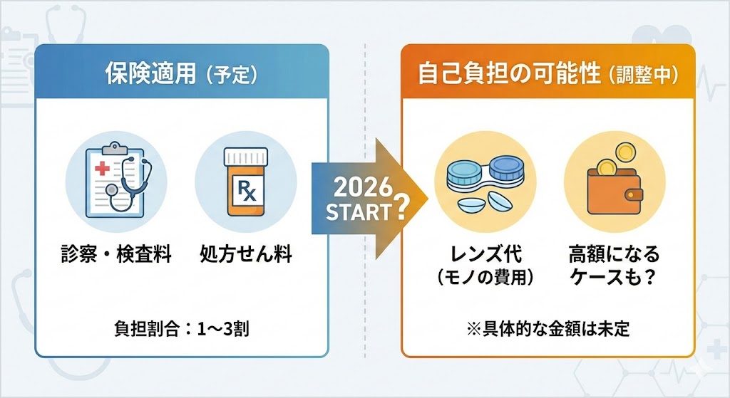 保険適用になっても、レンズ代そのものが劇的に安くなるわけではありません。今回の改正の大きなメリットは、「毎月の診察や定期検査にかかっていた数千円の負担が、保険診療(3割負担など)で受けられるようになること」にあります。